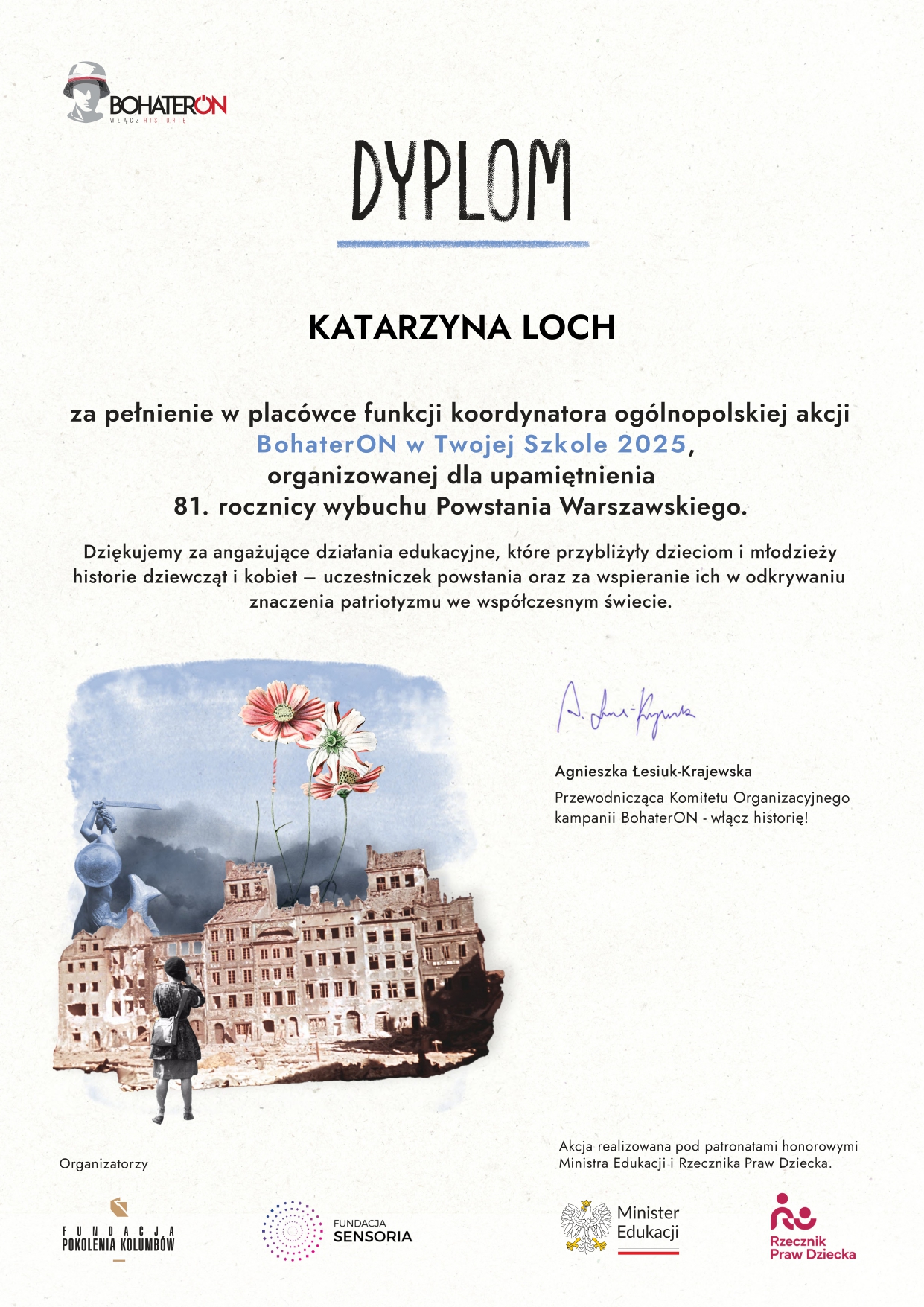 Jesienią nasza szkoła włączyła się w ogólnopolską kampanię BohaterON – włącz historię!, której celem jest upamiętnianie uczestników Powstania Warszawskiego, promowanie wiedzy o historii Polski XX wieku oraz krzewienie postaw patriotycznych i obywatelskich wśród młodzieży. W ramach realizacji tego projektu uczniowie wzięli udział w zajęciach edukacyjnych poświęconych Powstaniu Warszawskiemu i kobietom biorącym w nim udział. Dzięki takim akcjom pamięć o Powstaniu Warszawskim i osobach, które narażały zdrowie i życie dla wolności Ojczyzny, jest wciąż żywa.